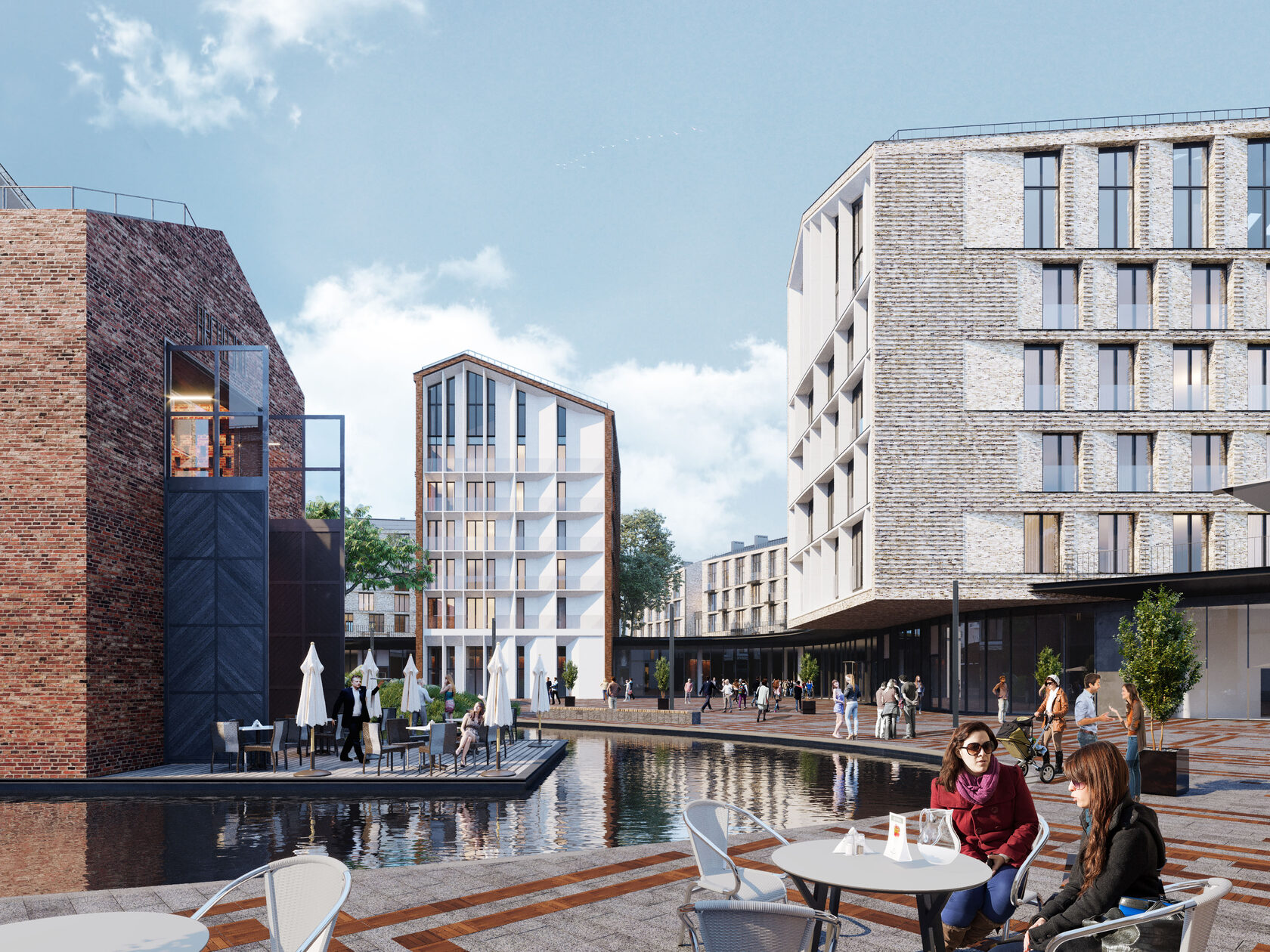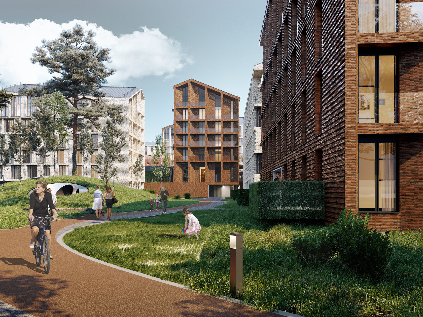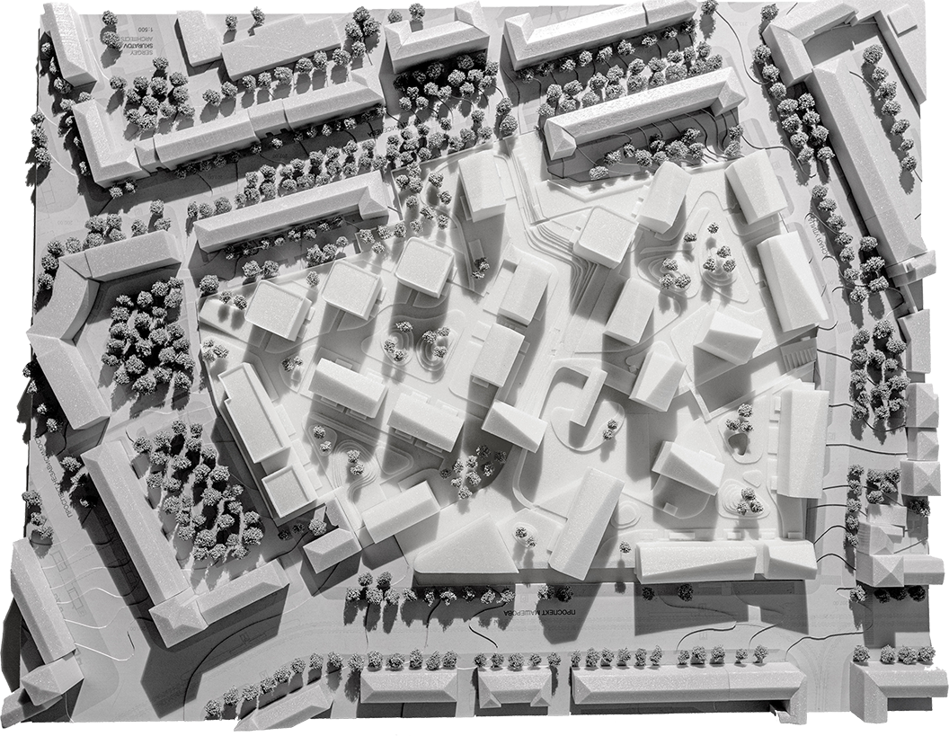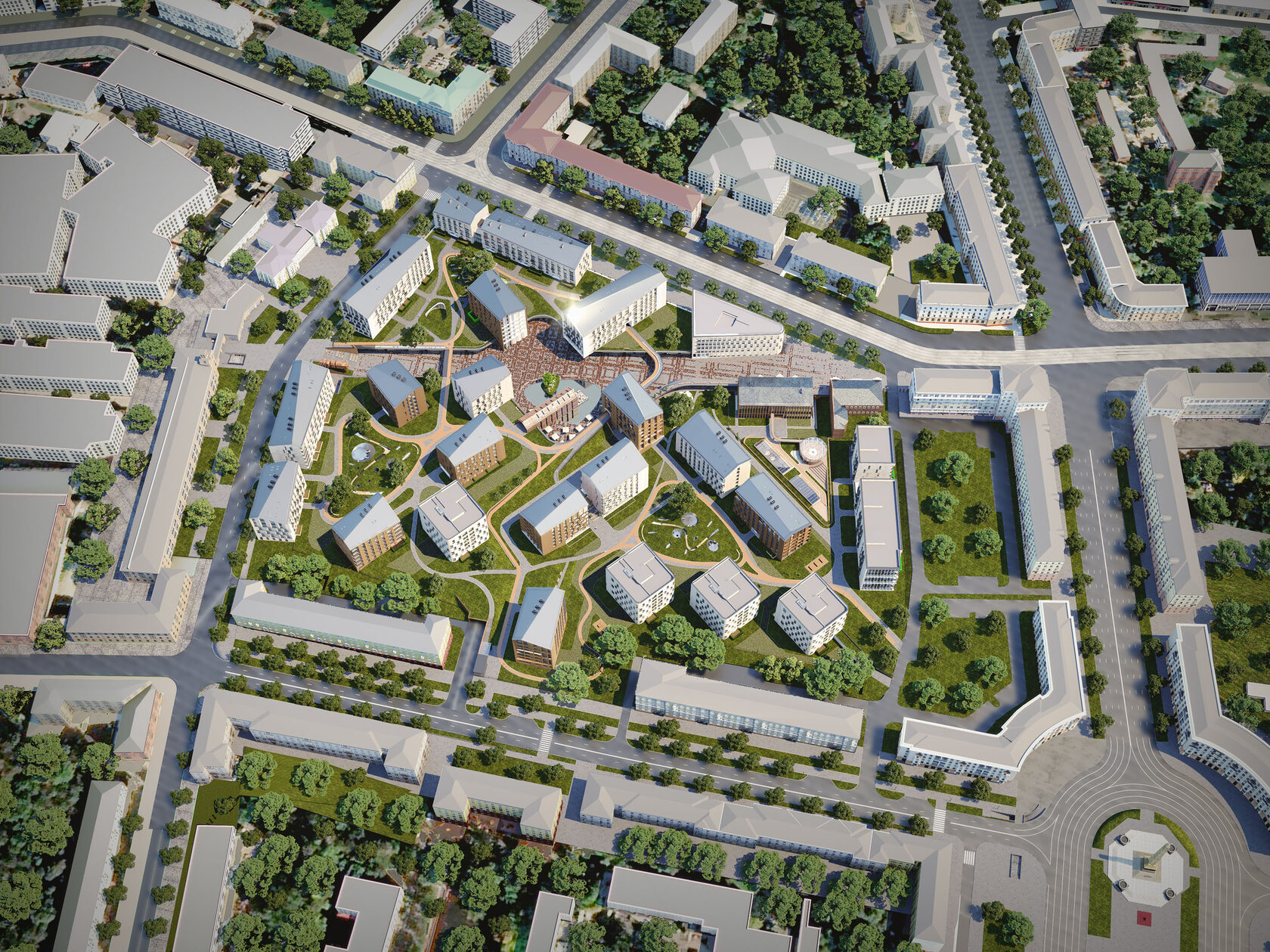 Визуализация комфортабильного жилого комплекса с объектами социально-общественного назначения и подземными паркингами.