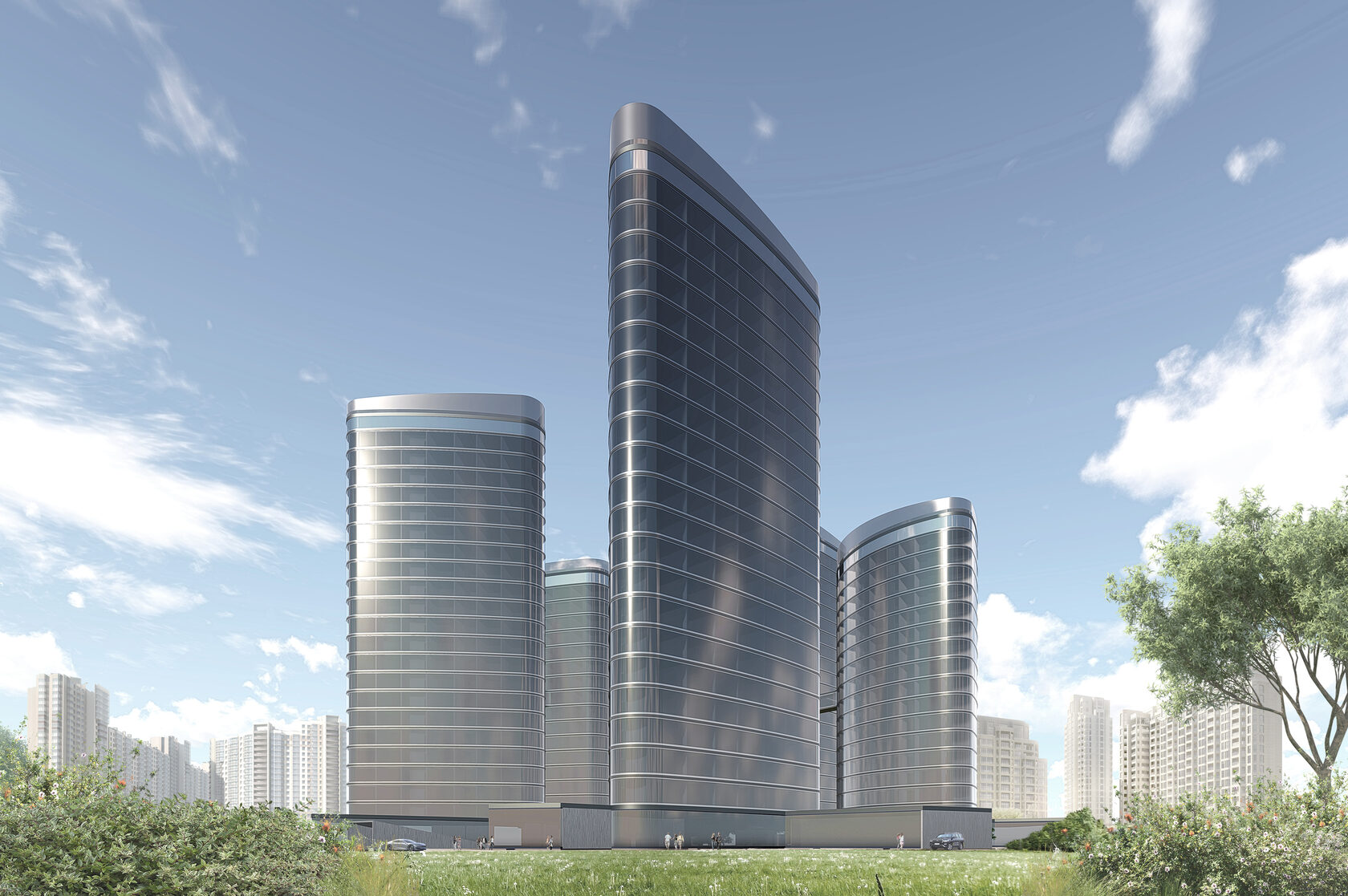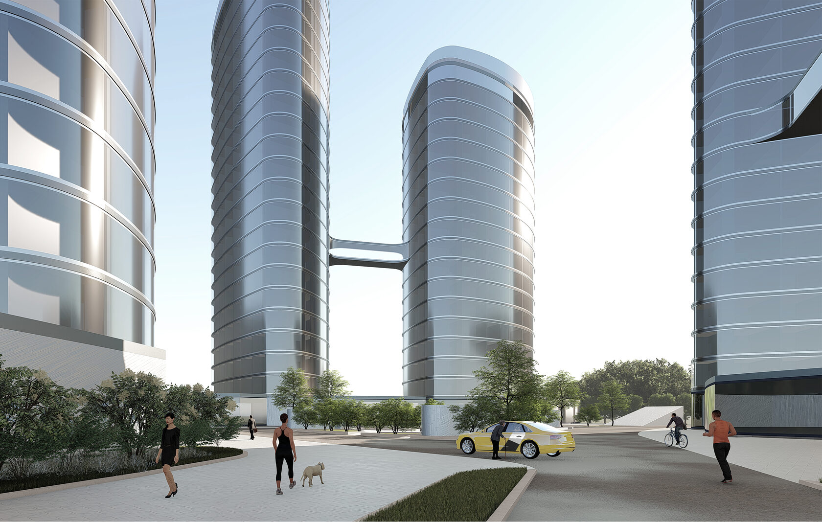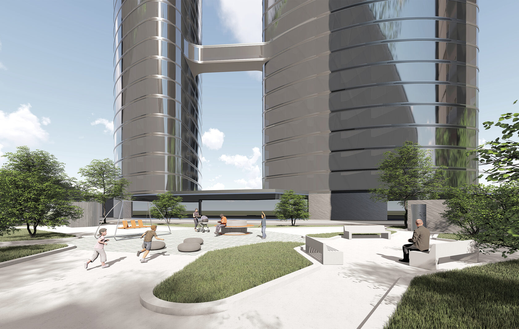 • Creation of centrality and organization of the dominant of the overall composition of the residential area (project proposal). Height, expressiveness of rounded shapes and minimalism of appearance are the main attributes of the current conceptual proposal.