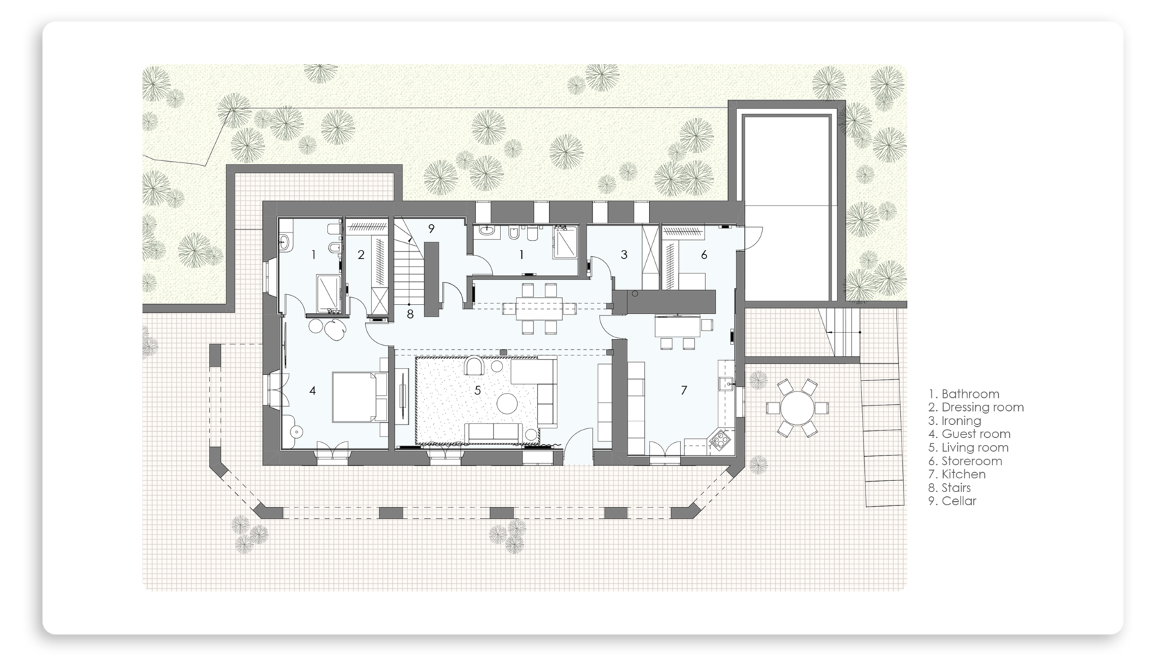 The cottage-type house was built in the old Italian style several generations ago. The walls are made of several layers of stone, high ceilings, high window openings. The project required modern adaptation, thinking through engineering networks and equipment. Creating a functional interior, sketch design and furnishing.