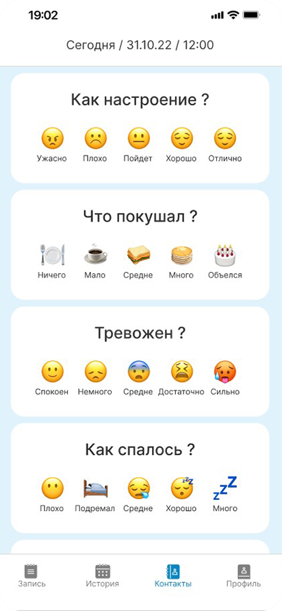 "Me care life" is a pocket diary of emotions. A convenient application for both patients and people who do not understand how to handle their anxiety. The service allows you to track various emotional states, help identify anxiety, disorder or depression.